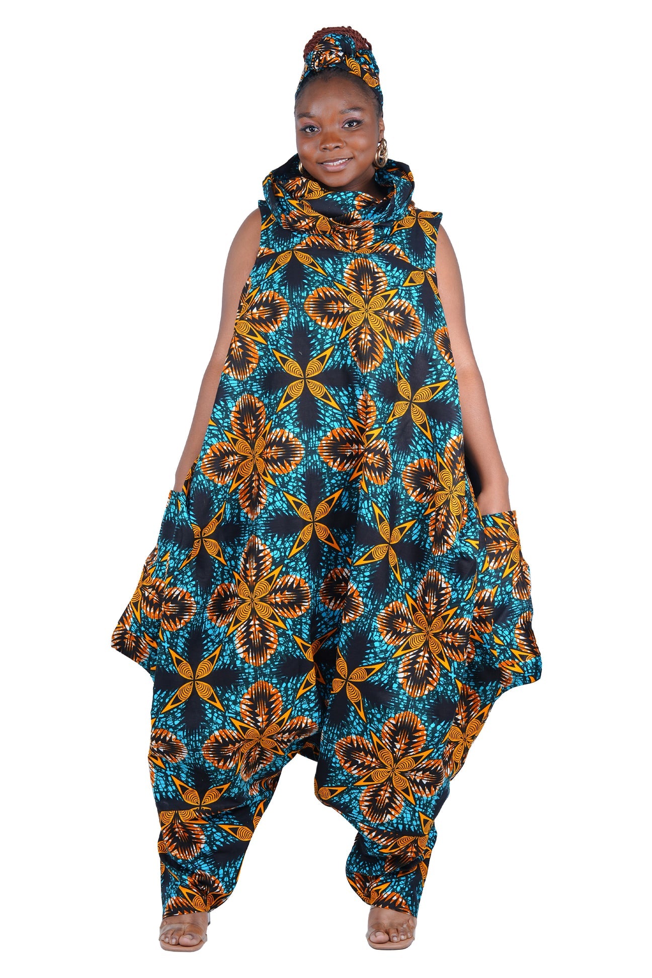African Print Parachute Jumpsuit w/ Headwrap | 100% Cotton