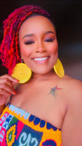 Available in two sizes, these earrings offer the perfect fit for every queen—Classic for lightweight everyday wear and Grande for those who love a fuller statement. Each pair is dyed and woven by hand, giving you a one-of-a-kind piece of Ghanaian craftsmanship.