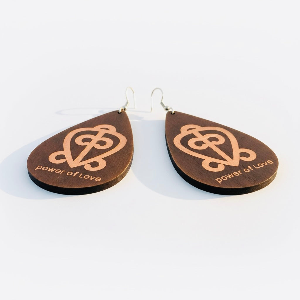 • Teardrop-shaped wooden earrings inspired by the Odo Nnyew Fie Kwan Adinkra symbol