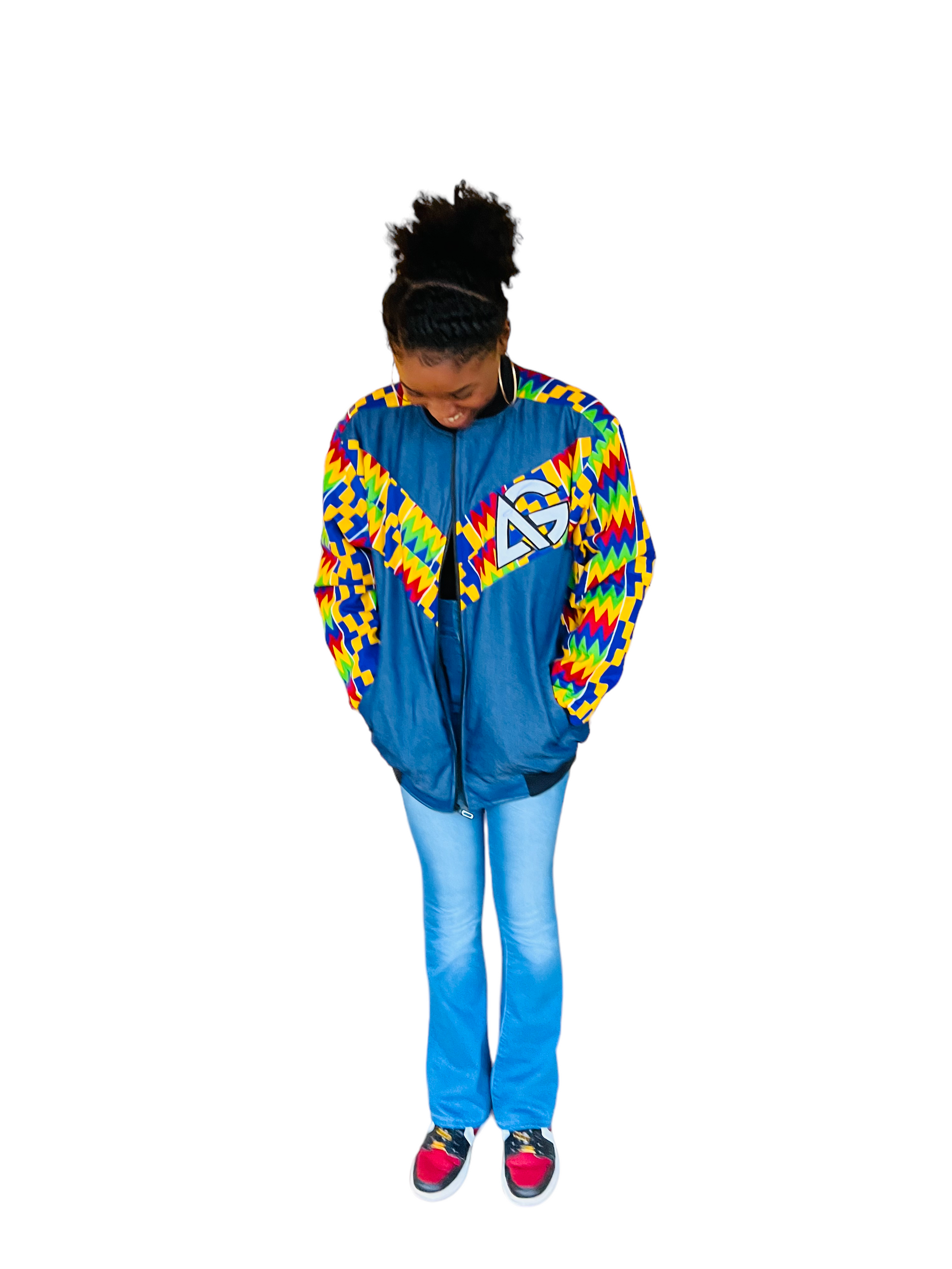 This unisex bomber jacket blends classic streetwear with bold African print details. The body features a solid blue base, balanced by vibrant Kente-inspired patterns across the sleeves and chest. It is made to stand out without trying too hard.